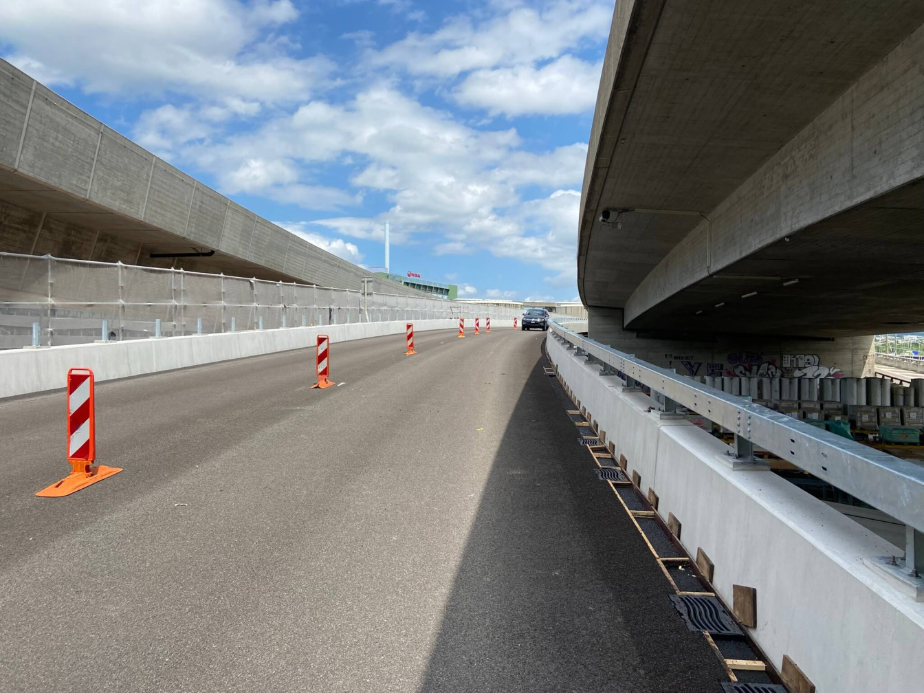Entwicklung, Bau und Installation von zwei einflügligen Mittelstreifenüberfahrten mit 84 Meter Öffnungslänge, automatischem Verschluss-System, Absenkungen und Aufhaltestufe «H2». Ausführung 2019